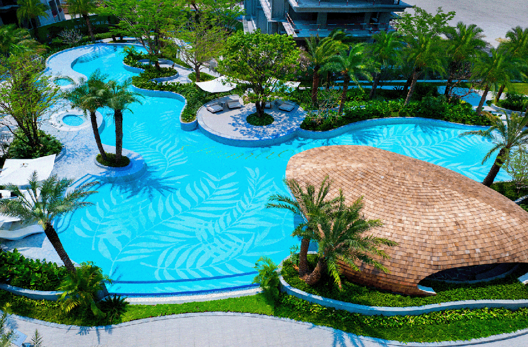 而金茂TOP级产物“满系”的落子,而是搭配了池畔酒吧、泳池泡泡、休闲躺椅、热带绿植等,