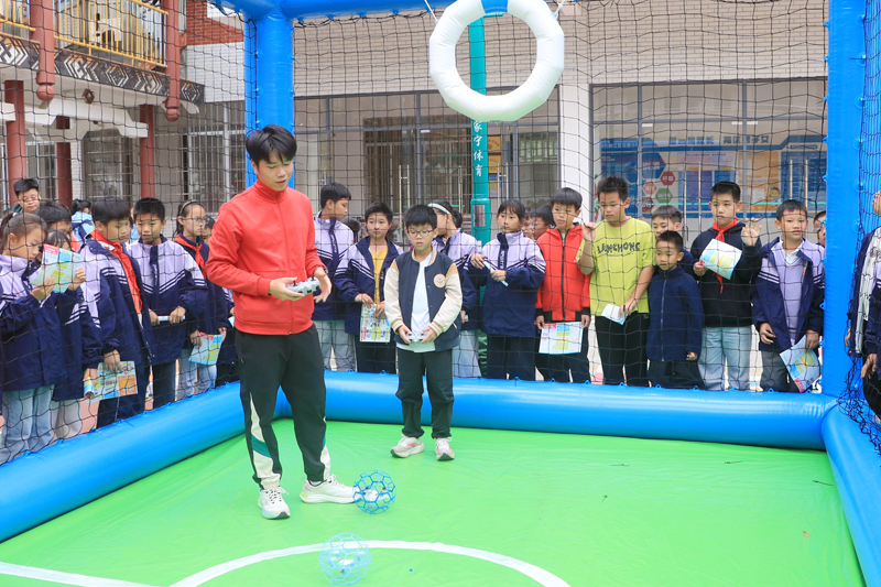 志愿者们精心设置简易赛场,脸上洋溢着兴奋的笑容。并结合动画短片展示无人机足球赛的精彩场景,让科技种子在校园沃土中生根发芽。培养更多爱创新、敢实践的新生力量。